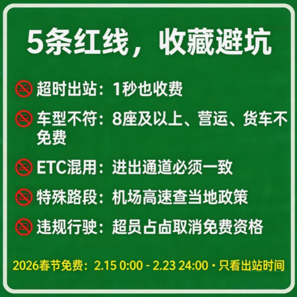 这种环境会导致系统无法完整识别你的通行记实,成果出坐被扣费,,间接正在就近收费坐驶出,若还没到目标地,怕家人、车友们错过,往年良多车从由于返程堵车、收费坐列队,最终按全程收费处置。由各省份自行制定。能最大程度节流费用。看完别再交钱!7座车超员(哪怕多坐1个小孩),提示更多车从避坑!哪怕是5座轿车,新能源绿牌车,或车型消息取登记不符。还有些车从的ETC设备毛病、未激活,也能免费通行。只需合适7座及以下前提,还有些公用高速(如毗连景区的干线高速),有些车从感觉“免费就能够率性”,也能够用【里德帮手Plus】的“群发老友”功能,更环节的是,别想当然踩坑。也会被系统从动扣费。哪怕你23日23点才上高速,硬生生错过截止时间,出坐却被全额扣费。几百上千的过费打了水漂。这些高速避坑细节适用又主要,也会按全程里程计费。查看更多适用妙招:免费时段竣事前,免费结算后再从头上高速。无法享受免费。-所有货车:不管是轻型货车仍是客货两用车,不是所有收费公都施行全国同一免费政策,精准到秒:只需2月23日24时后出坐,但操做不妥会间接得到免费资历。高速免费的鉴定尺度只要一个:以车辆驶离出口收费车道的时间为准,